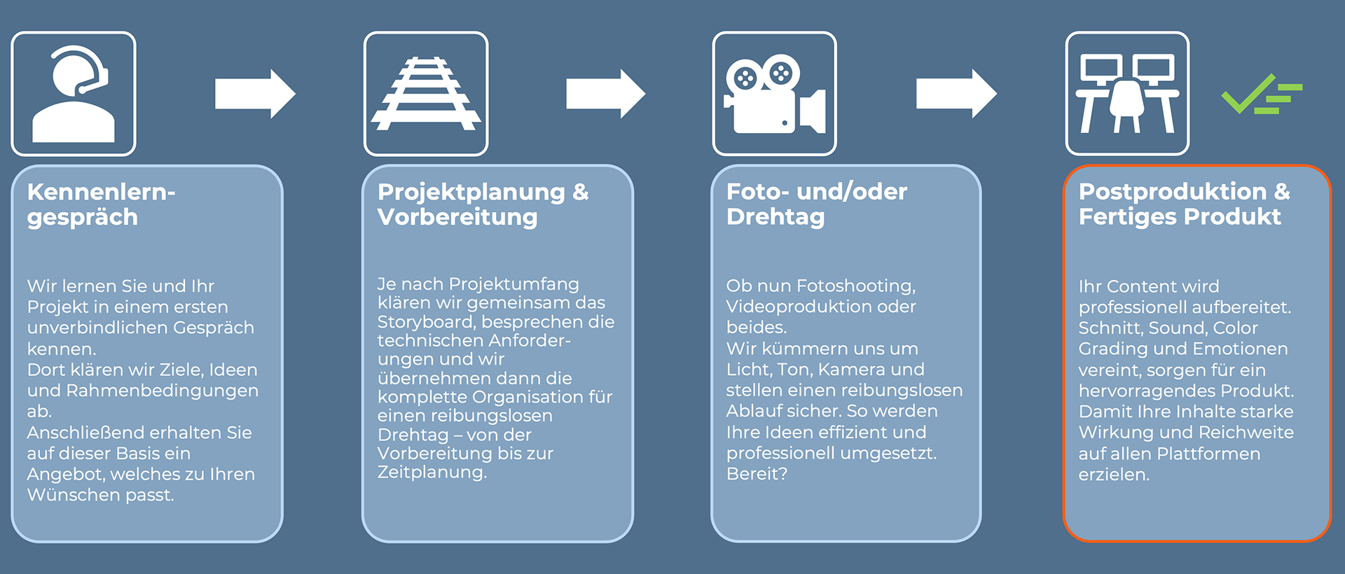 Visomia Films bietet eine Betreuung der Dienstleistung durch den gesamten Prozess von Anfang bis Ende. Die intensive Zusammenarbeit mit dem Kunden ist wichtig, um den Bedürfnissen und Vorstellungen vollumfänglich gerecht zu werden. Dadurch entsteht ein perfekt kreiertes Produkt.
